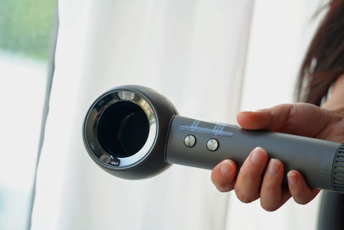 按键设置在手柄处,只有两个按键控制吹风,上面是风速/开关按键:长按2秒开机关机,点按则调节3档风速,下面是温度控制按键:点按调节3档风温,长按2秒冷热交替,长按5秒还可以进入自清洁,按键回弹力不错,即便盲按也能轻松知晓。