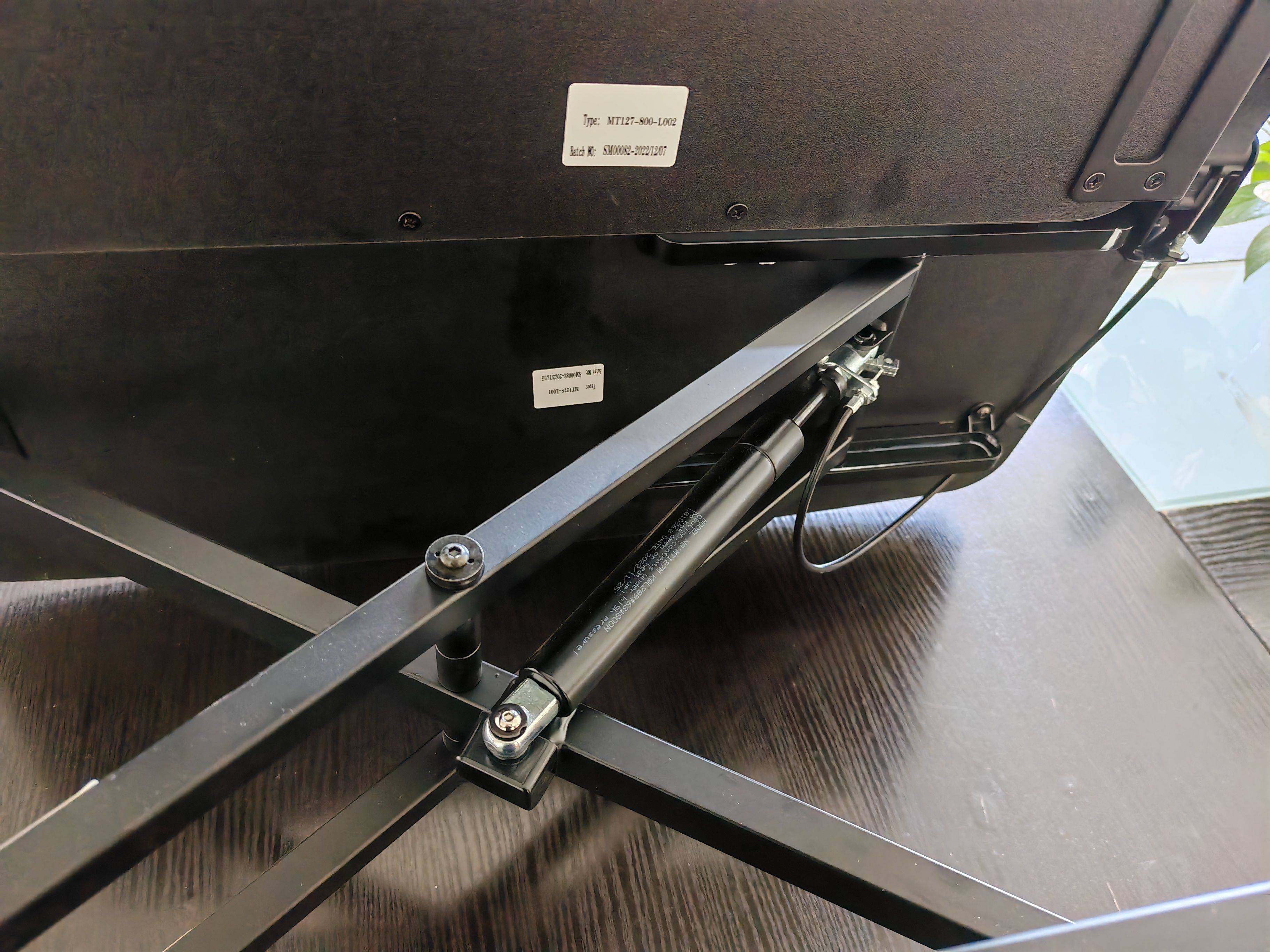 整个桌面升降台的核心部位:升降把手。整个乐歌桌面升降台MX1的升降控制依靠的是气弹簧助力系统,调整高度的时候只需要按住把手后,给它一个向上或者向下的力,就可以很顺滑的升降。
