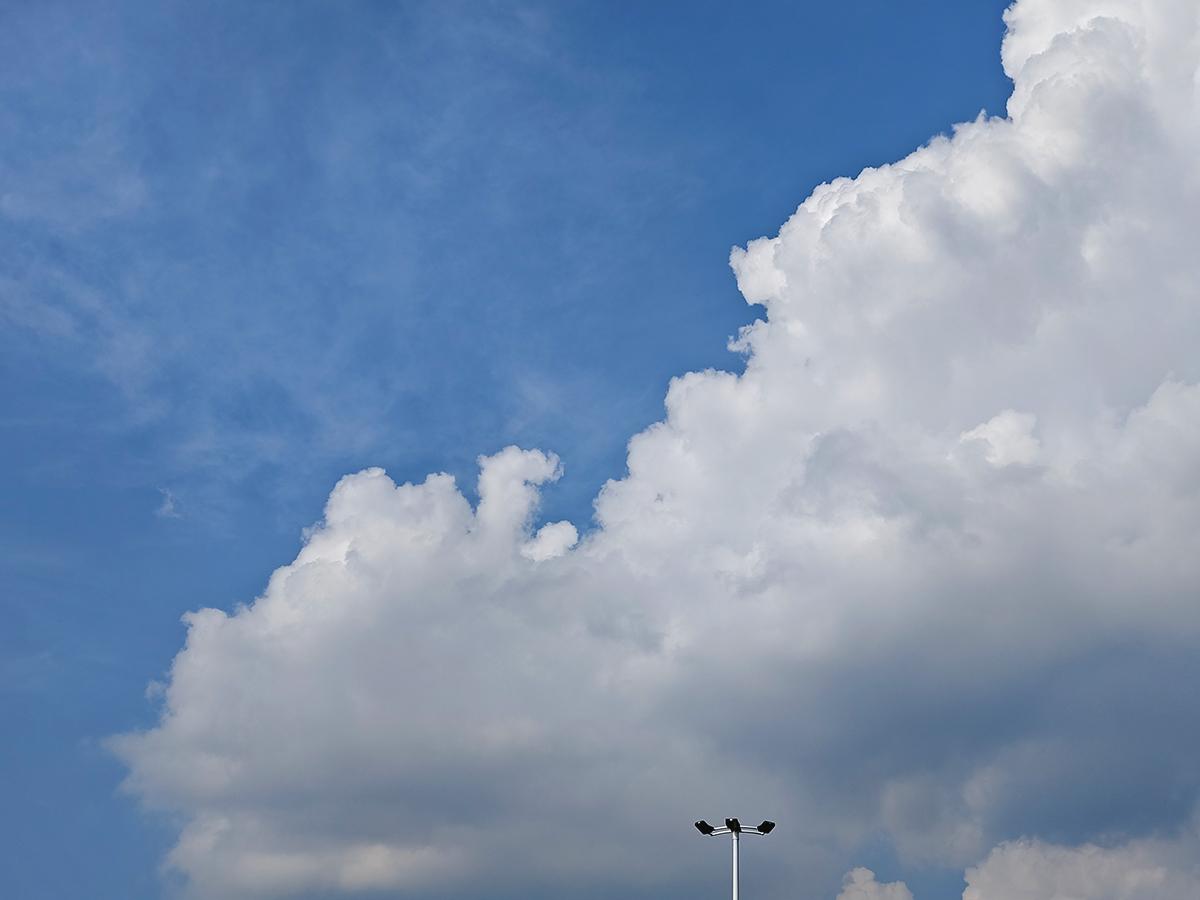 路灯的顶端和云相互呼应。敬畏自然的同时,也感慨人的伟大,已经将生存环境变的如此的便利。