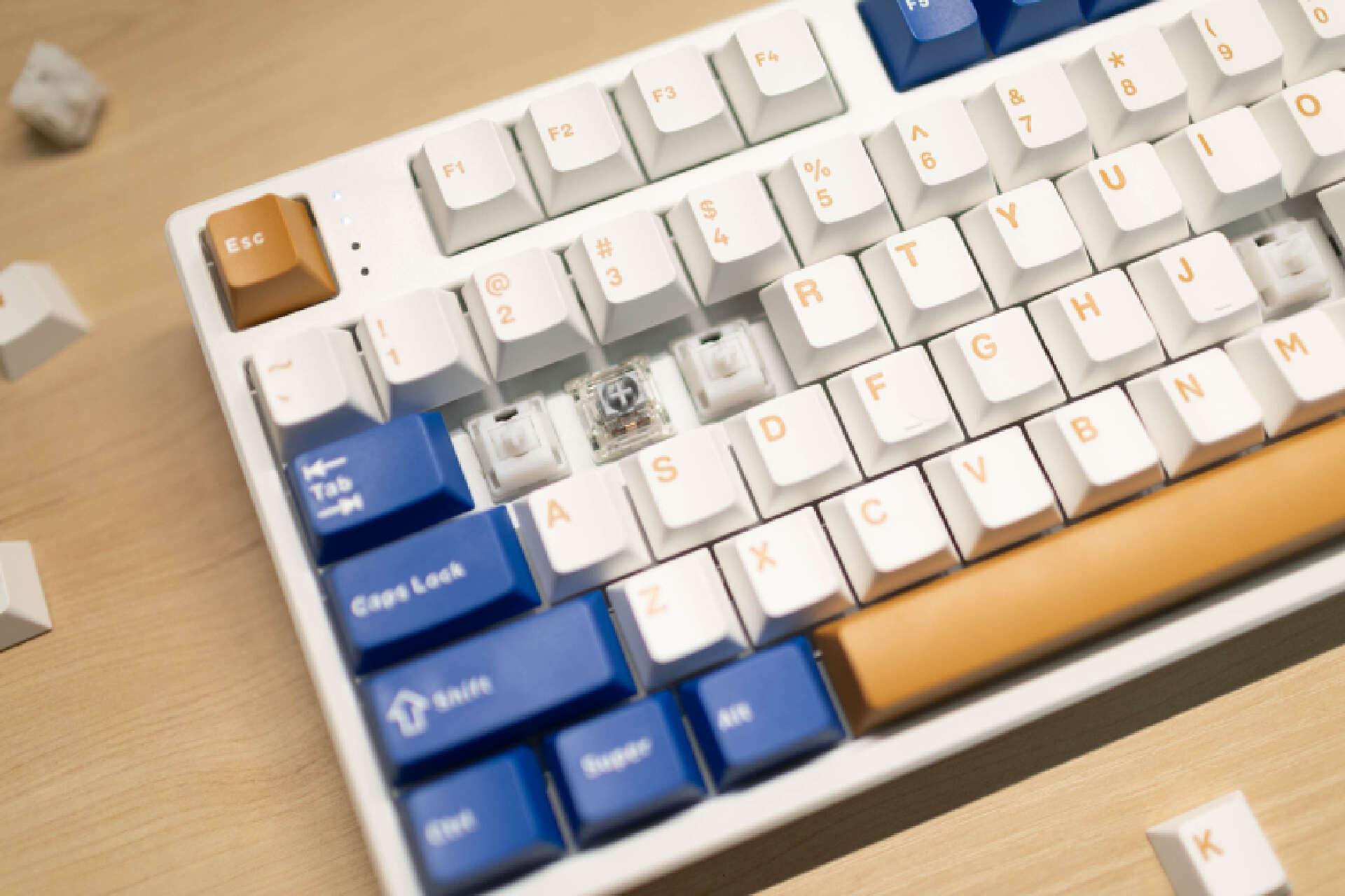 键盘采用三色键帽组合,HELLO GANSS提供了很多官方主题配色选择。我选择紺宇黄主要就是因为这套配色看起来干净利落,还颇有些高达主题的味道,相当对我胃口。键盘的大写,Num和SCRLK等状态指示灯都隐藏在ESC键的右侧。