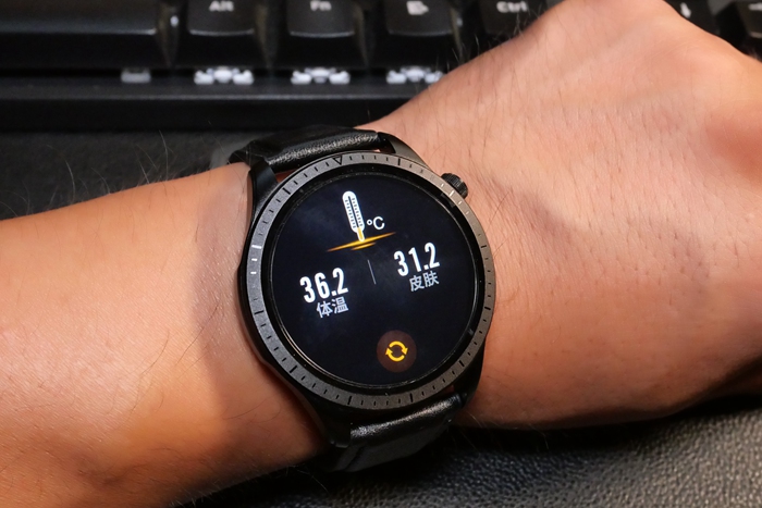 表盘右侧设计有两颗实体按钮和一颗电极键,点击可以进入更多设置,按键回弹力度适中,电极键则是我们进行ECG心电检测需要用到的。
