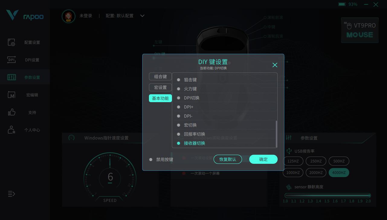 驱动-参数设置-DIY键-回报率切换-确认,即可根据场景需求,适配4K接收器的情况下,通过DIY键切换6档回报率(125Hz、250 Hz、500 Hz、1000 Hz、2000 Hz、4000 Hz),1K接收器下,DIY键可切换4档回报率(125Hz、250 Hz、500 Hz、1000 Hz);