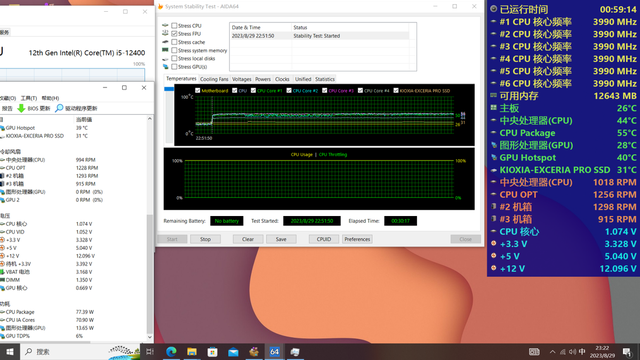 组建完,我们就来测试下成果。使用软件aida64、FurMark;测试环境室温24度;乘风MX600机箱全封闭;测试平台ROG B660-A吹雪,i5-12400,RTX3070。
