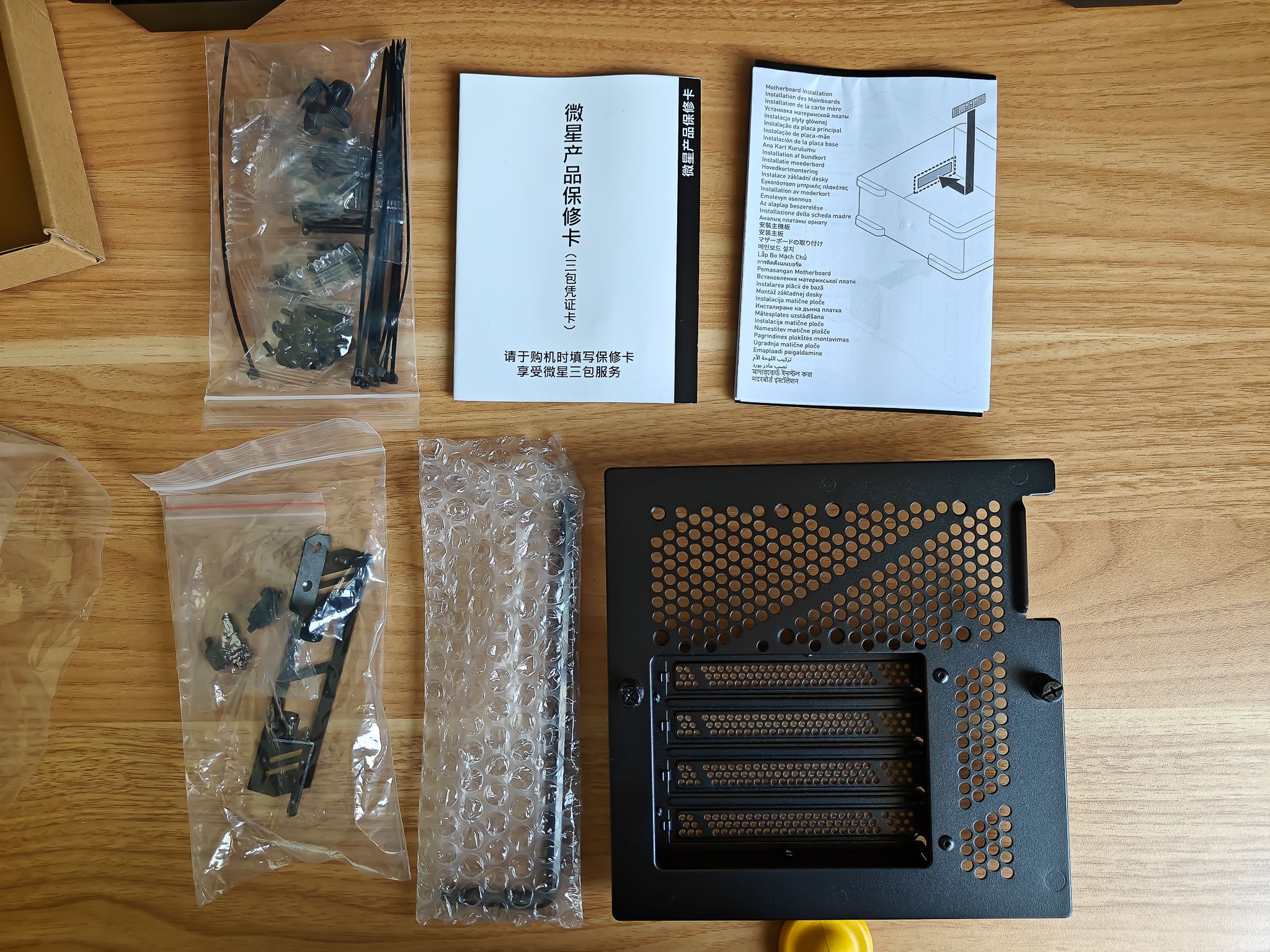 首先我们看看配件盒里都有什么,除了常规的机箱螺丝备件包外,还有一个显卡竖装支架、螺丝刀,小风扇安装支架。