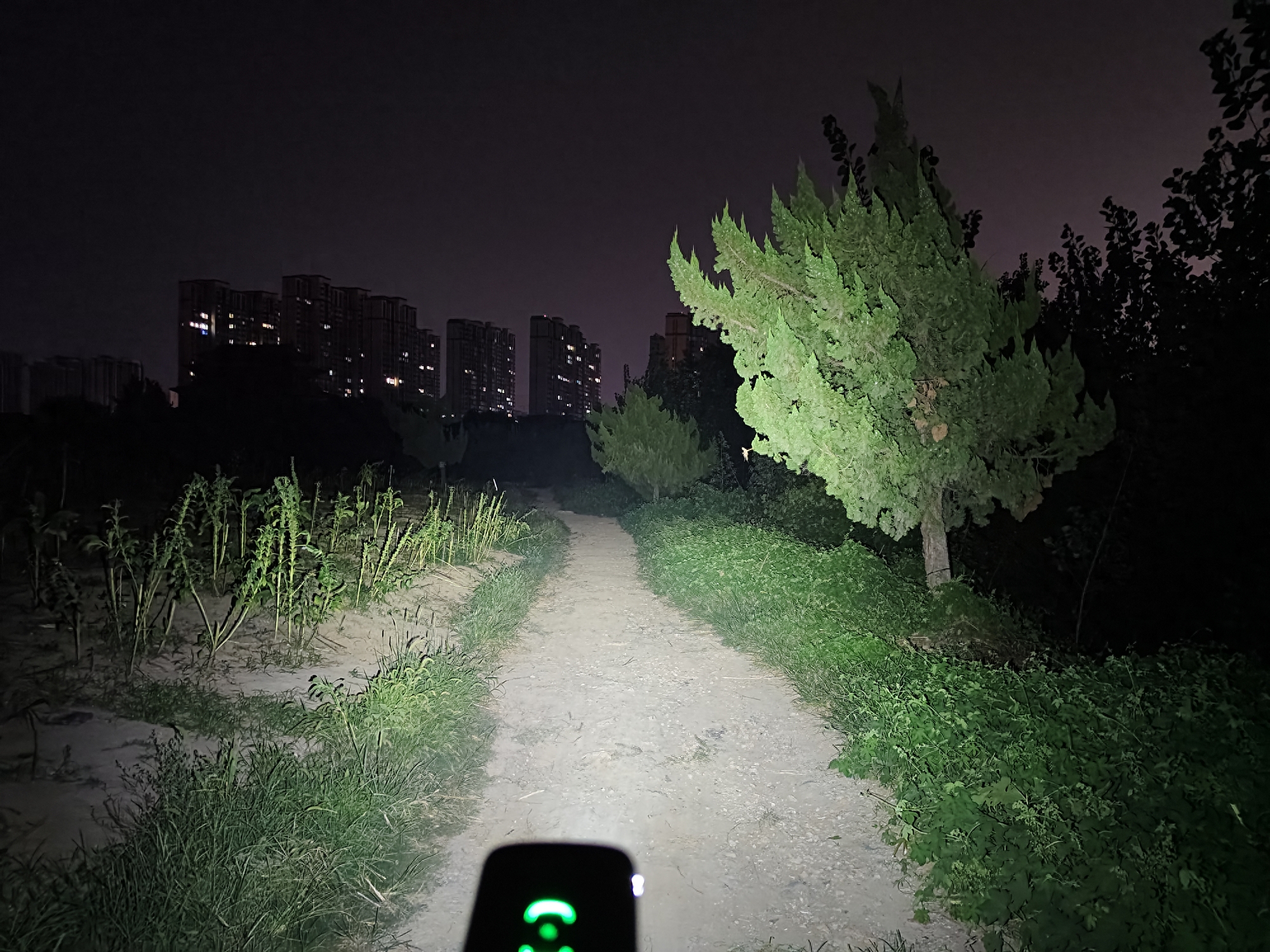最后来看下夜骑时的照明表现吧:前面说过,近光模式是可以单独打开的,所以首先来看下近光表现。实测开近光后,铺路效果十分出色。前方及其左右周边都能被亮光所“光照”到。特别是高亮档下的泛光区域大且亮,道路两旁都能覆盖到,视野也更开阔。出光的方向是向下的,在保持大泛光的同时不会对过往路人造成影响。很适合在滨河游园及人行道路上照明使用。
