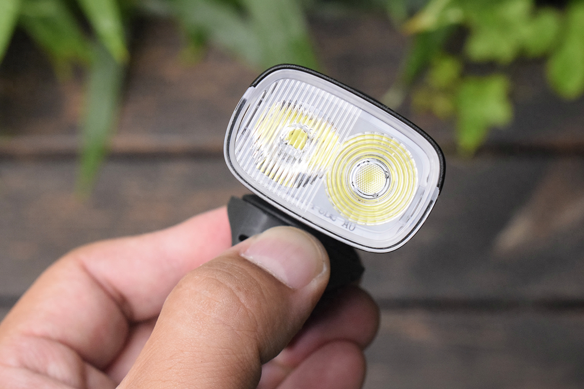 这两个灯头一个负责远光,一个负责近光,我们调近下细节就可以看出端倪。之所以如此设置是考虑到在路面上行人及行驶车辆多的时候,开近光就行了,不会打扰到TA人。亦能适应不同夜骑场景下的实际需要。