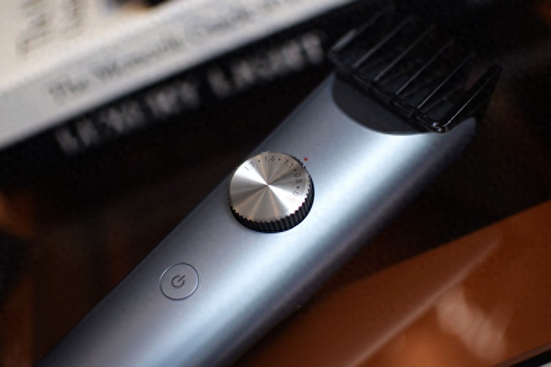米家理发器2尺寸为182*48mm,机身上有一个金属旋钮,它是用来调节精剪档位的,可以从0.5mm到1.7mm这个范围(5段精修)进行精细调节,操作上简单易行。而且上电后,机身上的隐藏数码显示屏可以显示档位、提示保养、显示电量、显示旅行锁等状态。