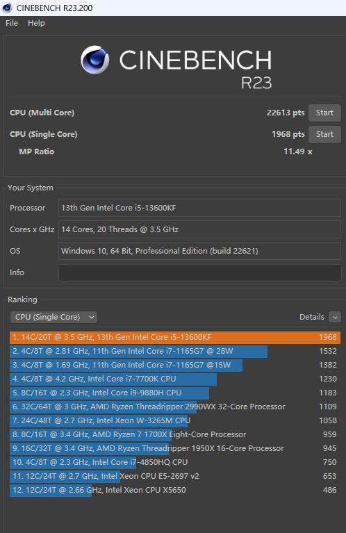 CineBench R23性能测试,单核1968pts,多核22613pts。