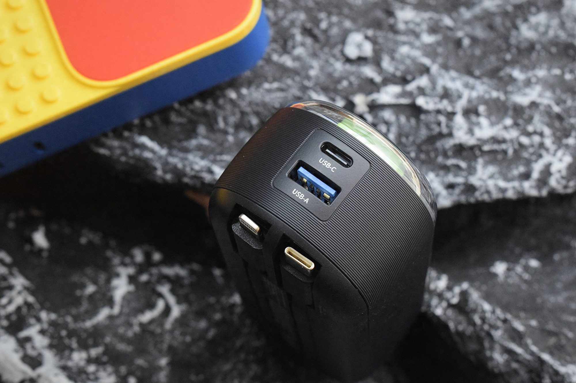 除了这两条自带线以外,在机身侧角还有一大一小两个USB口,其中USB-C为输入/输出口,支持30W输入和45W输出;而USB-A最大支持22.5W输出。加上这两个充电口后,“太空舱”就可为四台设备同时提供电力,试了下手边的手机、平板、Switch游戏机等都能同时快速充电。