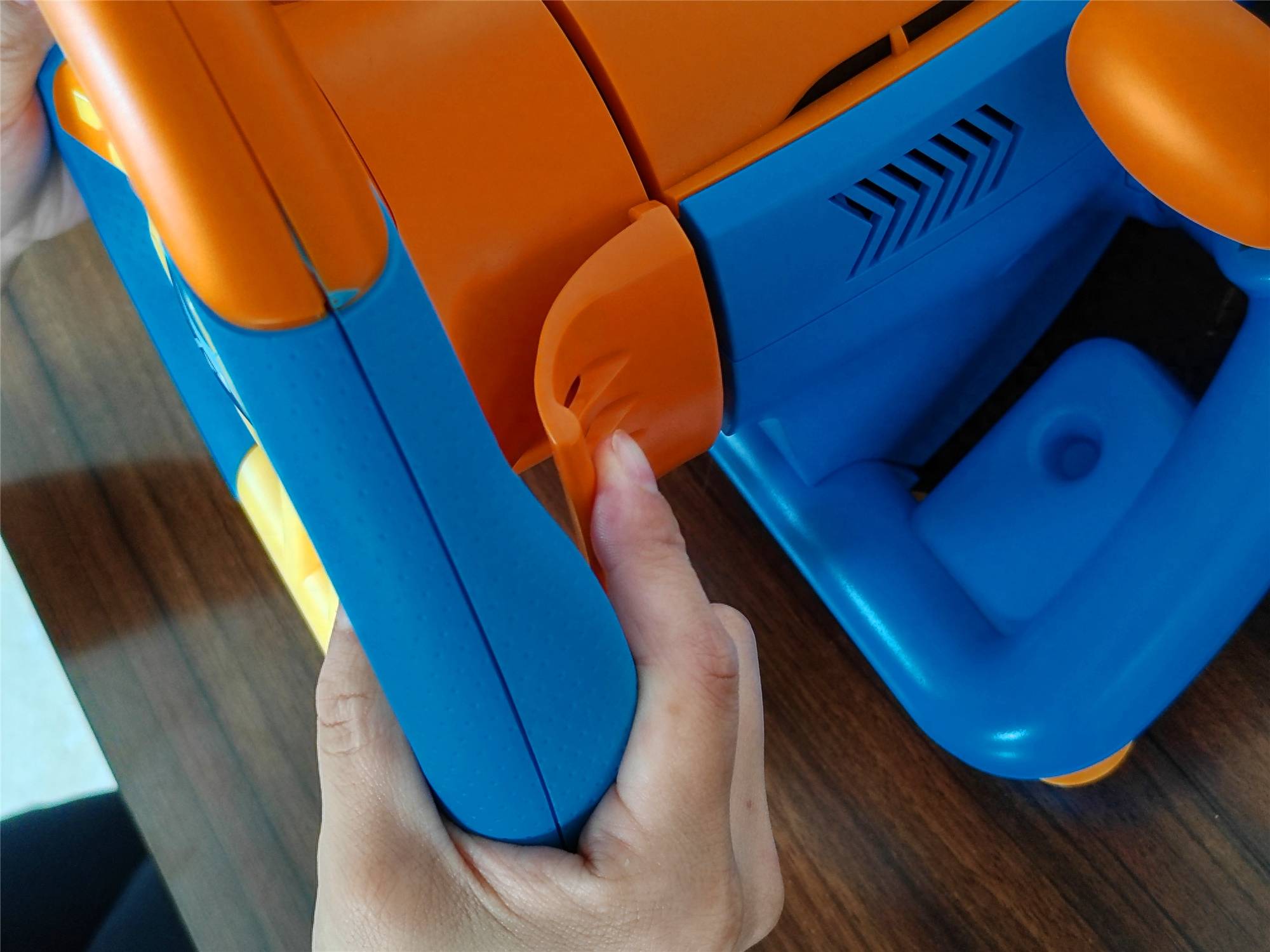 直接开箱,首先拿出的就是方向盘了,满满的儿童科幻可爱风,夏柑蓝和水粉蓝两种配色,夏柑蓝(橙蓝)更适合男孩,所以我选了夏柑蓝款。
