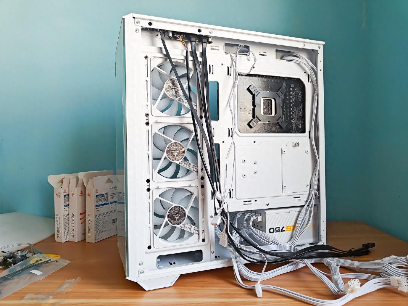 三只白色的风扇,注意这个侧面,也是有玻璃的,上面有出厂贴纸,要拿掉哦。