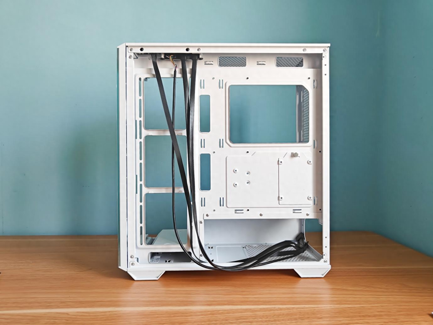 将机箱抱到桌面上,白色的机箱看起来更加清爽,机箱内部一览无余。