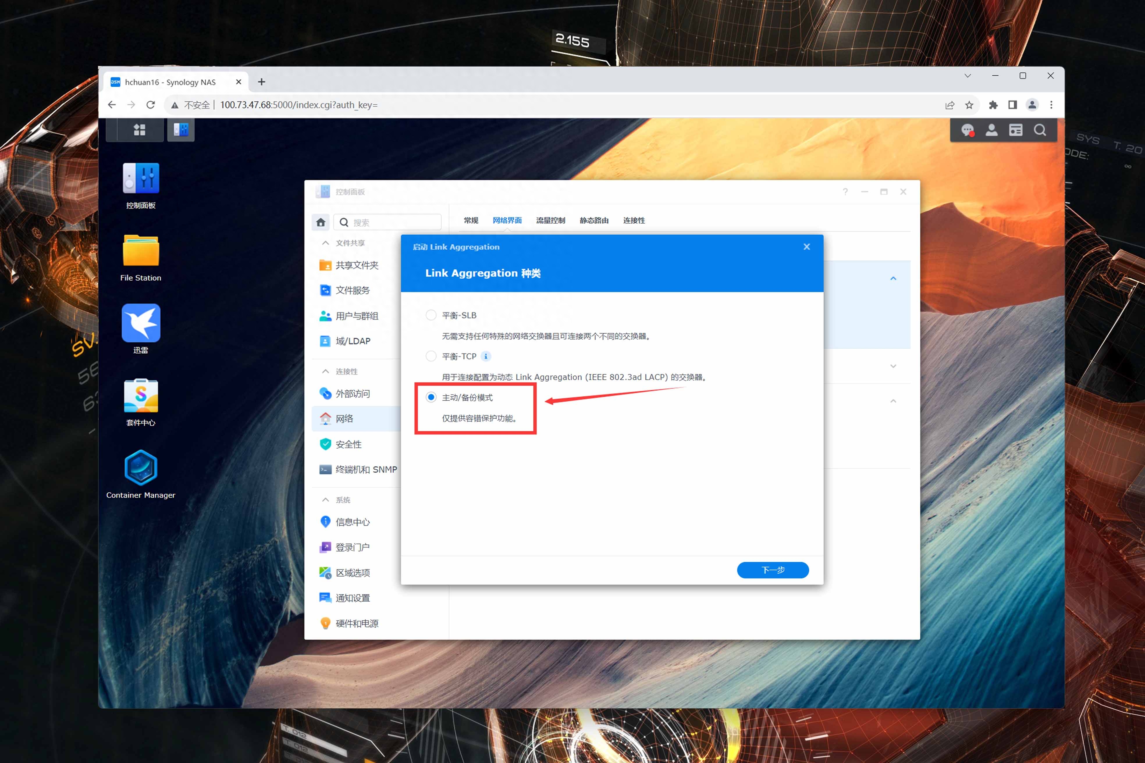 上图的故障转移针对线路问题,如果只有一条线路且担心网口物理损坏导致断联,可以选择用网口聚合的主动/备份模式(一般也叫Bond1)作为替代,大部分多网口NAS都支持。
