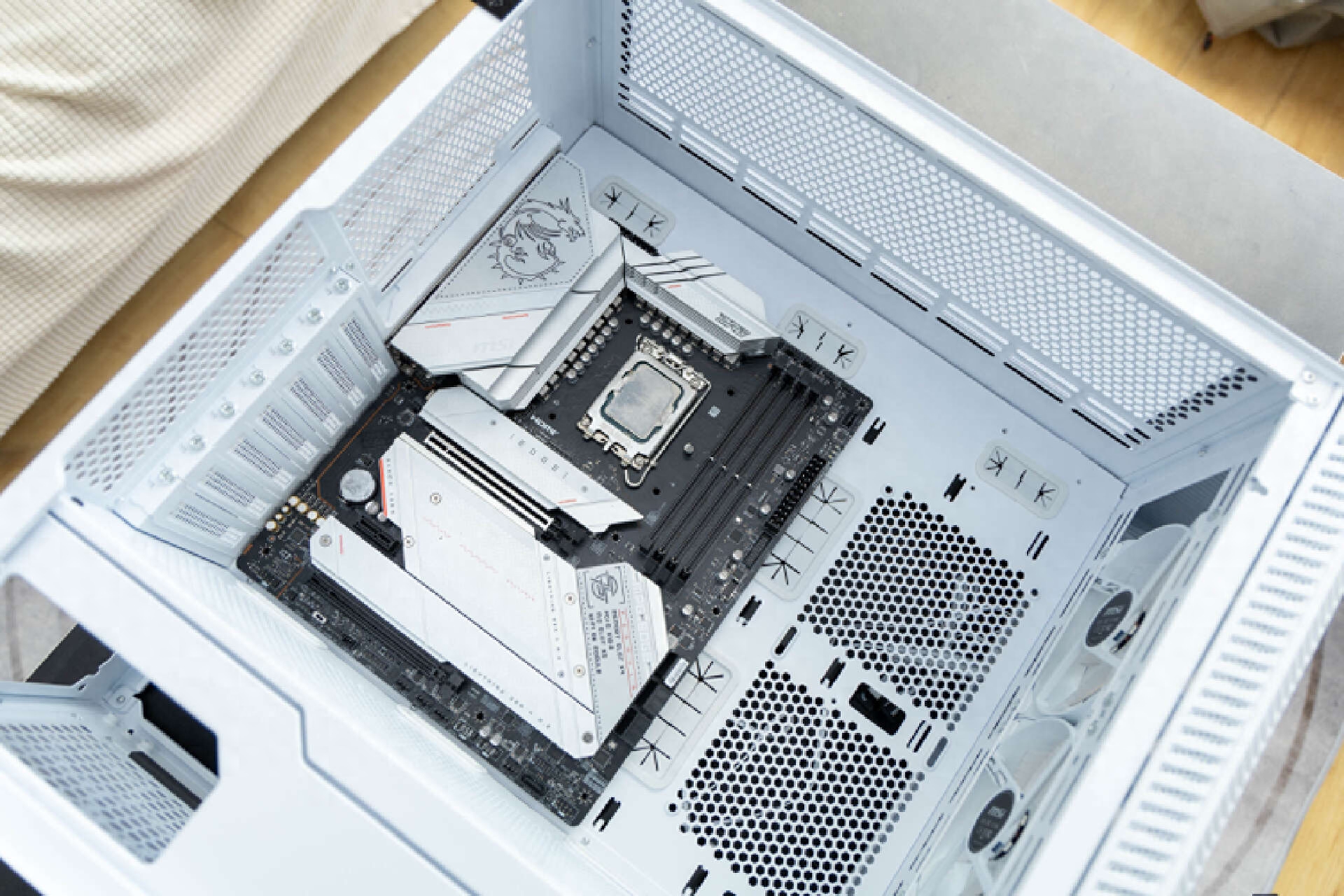 如果需要超频内存,官方推荐使用DIMM2和DIMM4的组合,这也是我选择16G*2套装的重要原因,安装内存后,从侧面看可以发现内存装甲的用料真的非常扎实,平整的内存装甲顶部也能兼容大型风冷散热塔,白色的套装也能更好的搭建出全白主机的效果。