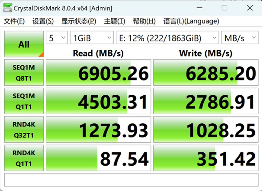我们使用AS SSD BenchMark进行测试,致态Ti600可以取得5690MB/s的顺序读取以及5461MB/s的写入速度,得分可以达到8389,基本上是主流PCIe 4.0的分数了。
