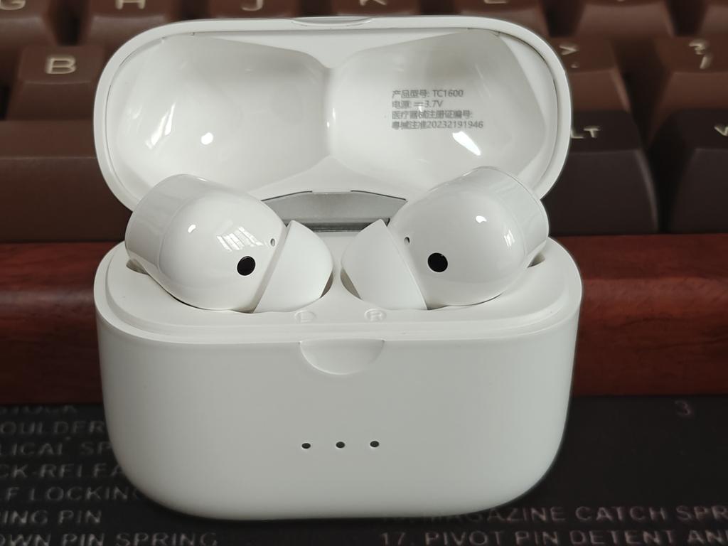 包装内的配件挺丰富,包括:町石TINX助听器充电盒和助听器(在充电盒内)、Type-C充电线1根、防丢绳一根、清洁刷1把,大、中、小耳膜3套(默认安装好一套中尺寸)、说明书和产品操作指南。