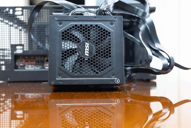 电源底部使用的是一枚120mm FDB动态液压轴承风扇,散热栅格密集排列,配合中心圆形的MSI标识和框架接口,呈现出一个非常立体的造型。