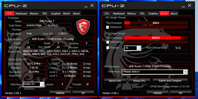 在CPU性能释放方面,这颗AMD 9700X的硬件规格依然是熟悉的8核心16线程,4nm制程,三级缓存32MB,睿频最高5.5GHz。在默认设置下,CPU-Z单核得分846分,多核得分8043分。