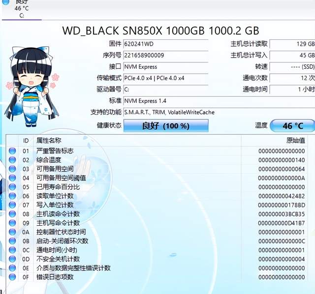 固态硬盘方面,通过CrystalDiskInfo软件查询,我们可以看到SN850X的待机温度仅为46℃。工作协议为PCIe 4.0×4,支持S.M.A.R.T、TRIM以及VolatileWriteCache等功能。