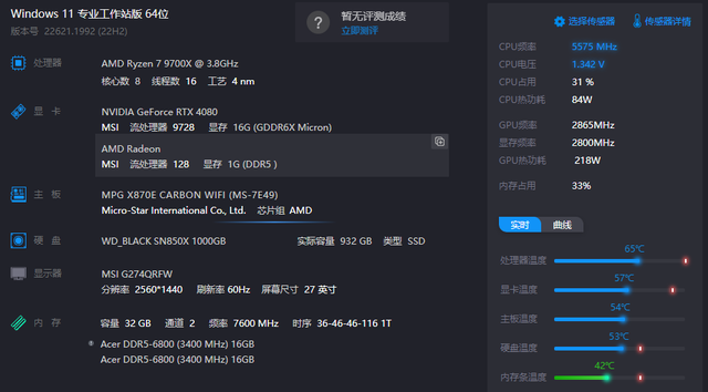 首次测试时,我没有安装显卡。AMD 9700X内置核显性能也能满足基本的图形处理需求,适合日常办公、浏览网页、观看视频等轻度使用场景。