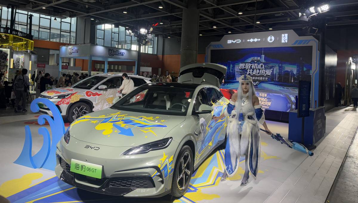 比亚迪展台以「智敬初心 共赴热爱」为主题,巧妙地将汽车与当下热门的动漫游戏元素相融合,为参观者打造了一个沉浸式的体验空间。展台分为三大展区,各具特色,让人目不暇接。