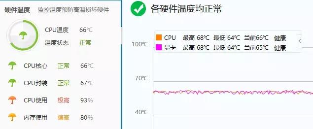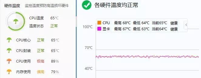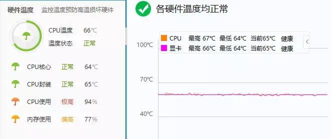 换用“小空调”最高档试试,结果有点意外,不到一分钟的时间,温度已经直接降到 67°C,并还在持续下降,最低温度达到 64°C,而它最终也稳定在 65°C 左右,散热效果还算显著。