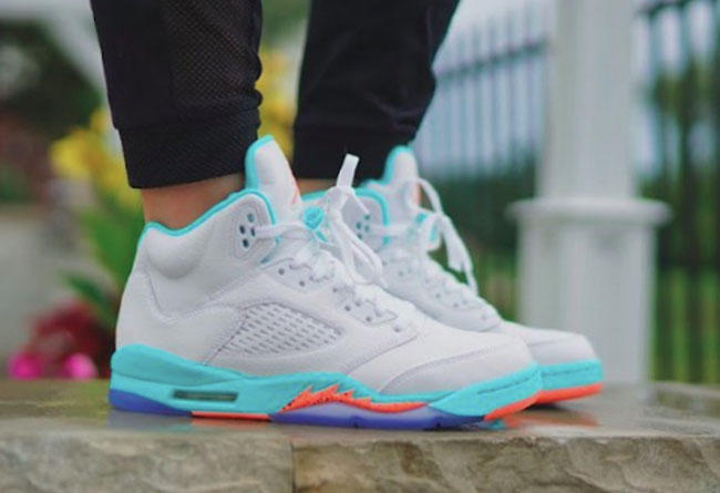 粉色的Primeknit,加之袜套设计,视觉上很吸引人!看着是不是很容易给人一种少女可爱的风格呢?这双粉色的NMD R1将于 8 月 1 日发售,让我们一起期待啊!2、Air Jordan 5 “Light Aqua”
