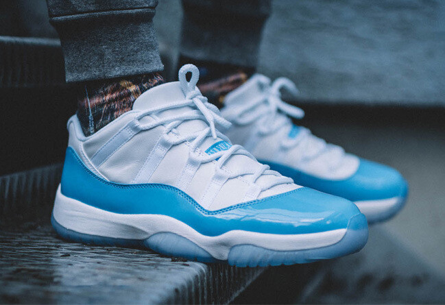 AJ 11酷灰的鞋面是由麂皮构成与AJ 11的标志性漆皮让整款鞋的质感大幅度上升,白色的尼龙鞋带则与白色的中底和水晶鞋底遥相呼应,低调的配色再加上鞋底全掌碳板的缓震,这双鞋也挺适合穿着去上班。Air Jordan 11 Low 北卡蓝