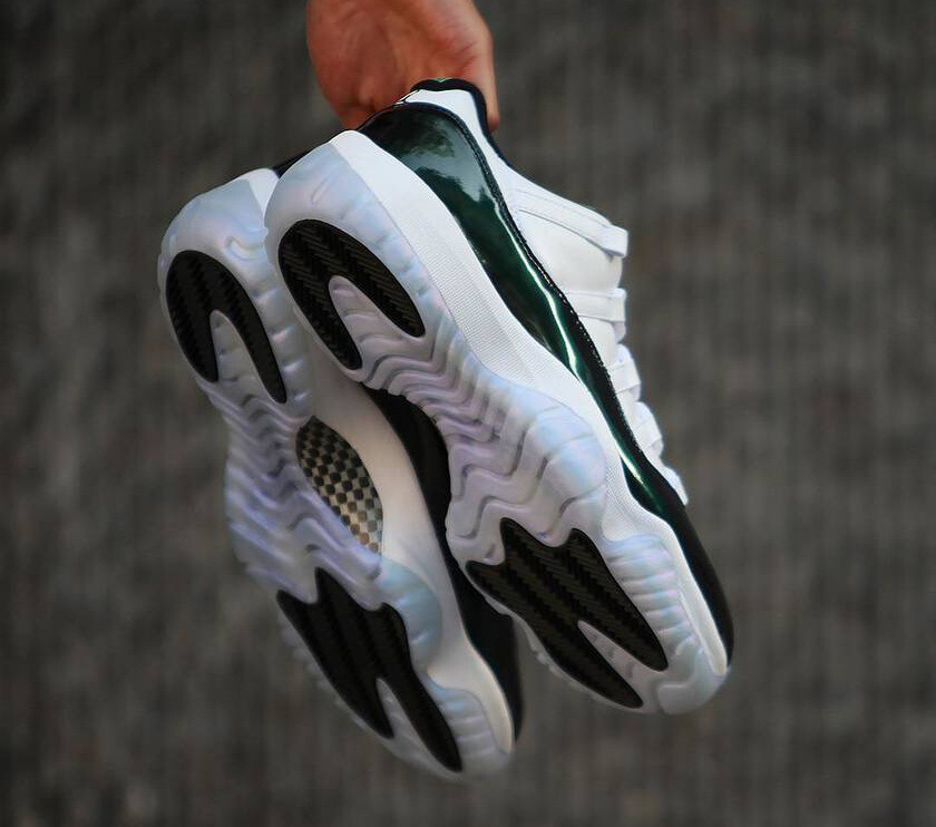 因为与经典Air Jordan 11 Low Concord及其相似的配色,这款AJ 11从开始发售到现在都一直被看好。这双AJ 11 Low主要由白色和墨绿色搭配,AJ 11鞋款独有的漆皮和水晶鞋底也相得益彰。