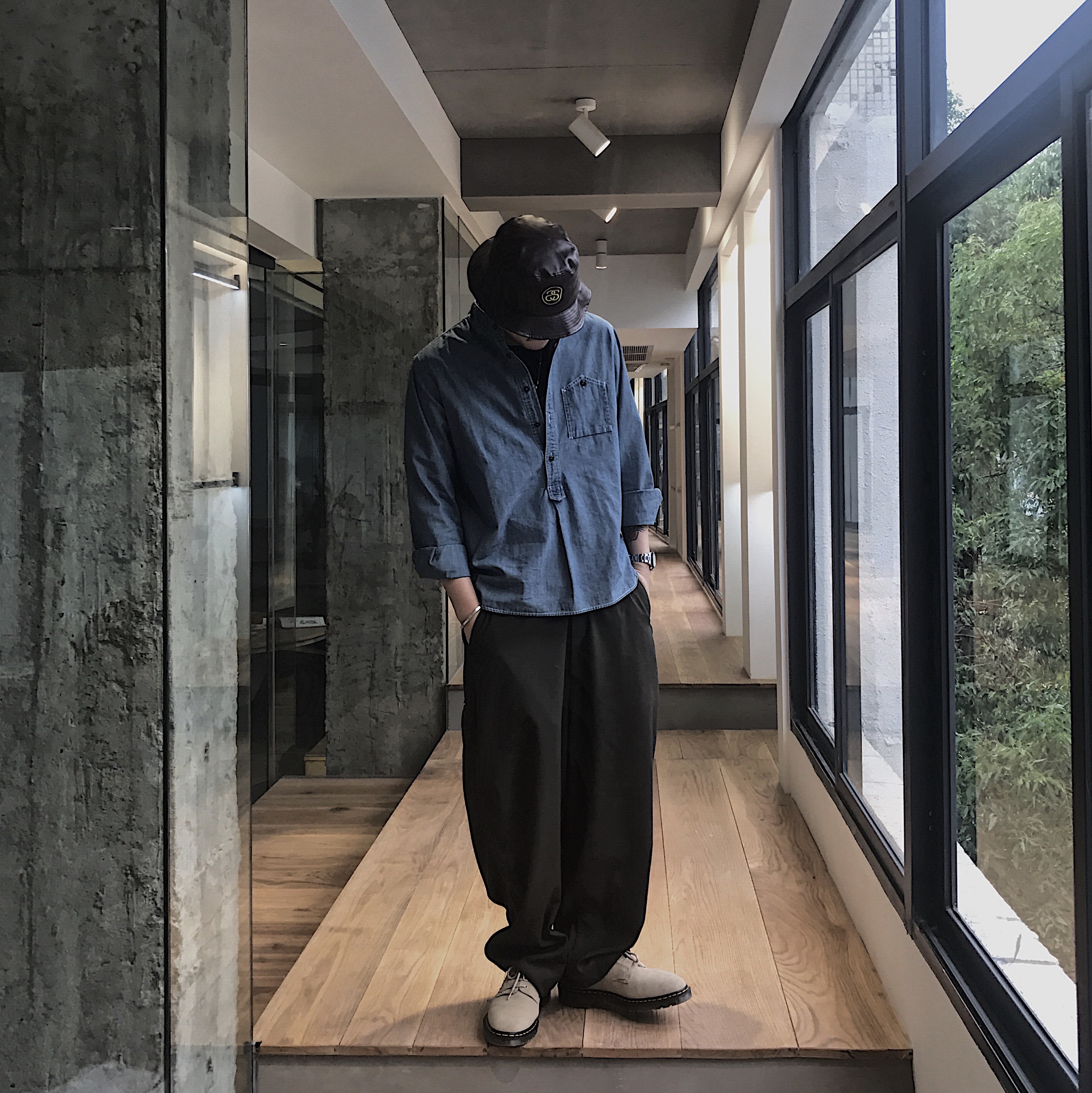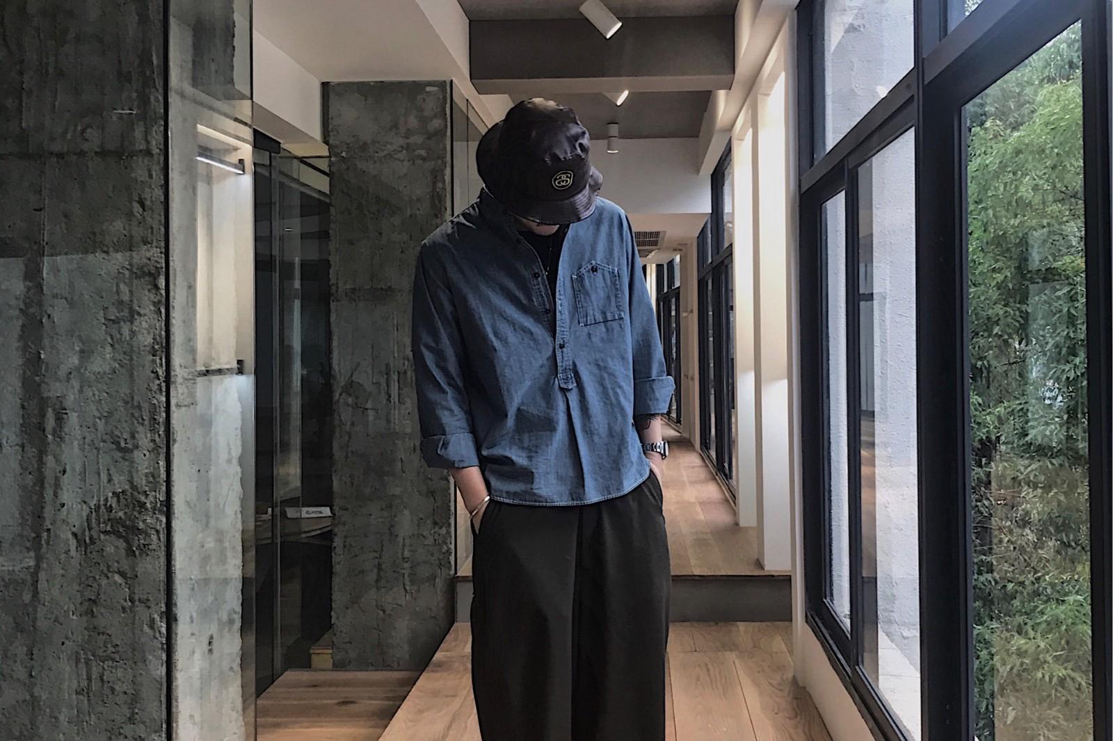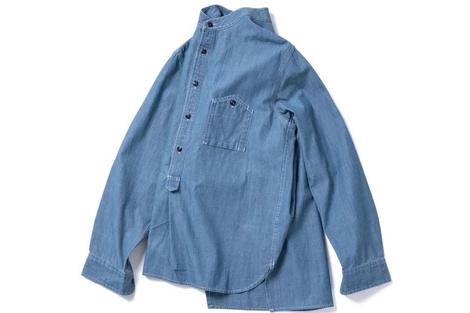 选用牛仔面料打造,参考古董工装衬衫设计的无领细节,整衣专门调试使用细密针距的三线埋夹,保证坚固耐用的同时,也增添了整体的美感。