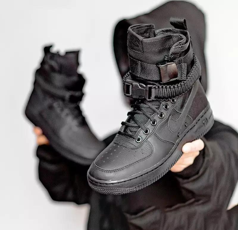 与前一双简洁的造型不同,这双Nike AF1 “Triple Black”的款式可谓是极尽高调。整体造型以纯黑配色为主视觉贯穿单品全身,鞋面采用皮革搭配尼龙材质制作而成,鞋帮为系带与搭扣双层设计,造型结合了af1经典鞋型并按照军靴鞋款加以改造,带来浓郁的军事黑魂气息!
