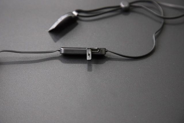 在线控的侧面,有电量符号标志的位置,打开就是耳机的充电接口了。这个充电接口的设计还是很紧的,所以一般的雨水也不容易从此进入耳机线控内部从而减少耳机寿命甚至直接损坏电路导致耳机无法使用。