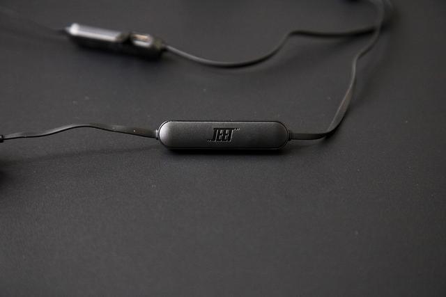 耳机整体左右两侧似乎都有一个“线控”,实际上左侧耳机的“线控”并没有实际可操作的功能,而是一个电池仓用于延长耳机续航,正面印着JEET字样的LOGO。耳机右侧对应的才是实际的线控,按钮布局与市面上蓝牙耳机一致,分别是音量加减和圆圈儿的多功能按键。