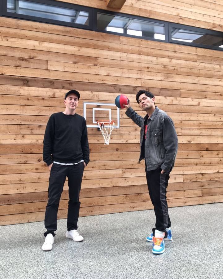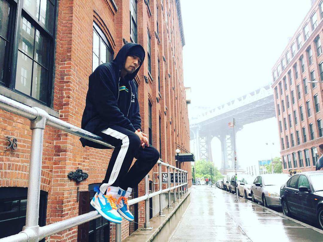 杰伦大约是很喜欢这双鞋啦~多次穿着这双鞋现身。黑色T恤+黑色连帽衫+黑色运动裤,all black的搭配,更突出unc的风格,周董的小心机就在于将鞋带换成橙色,和蓝色形成鲜明撞色。