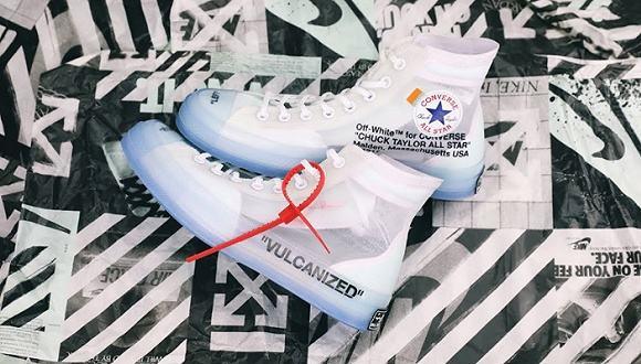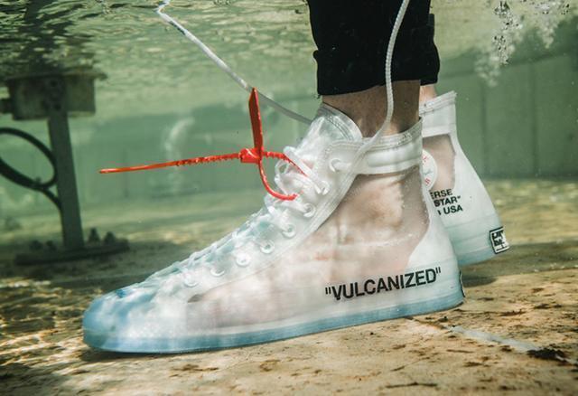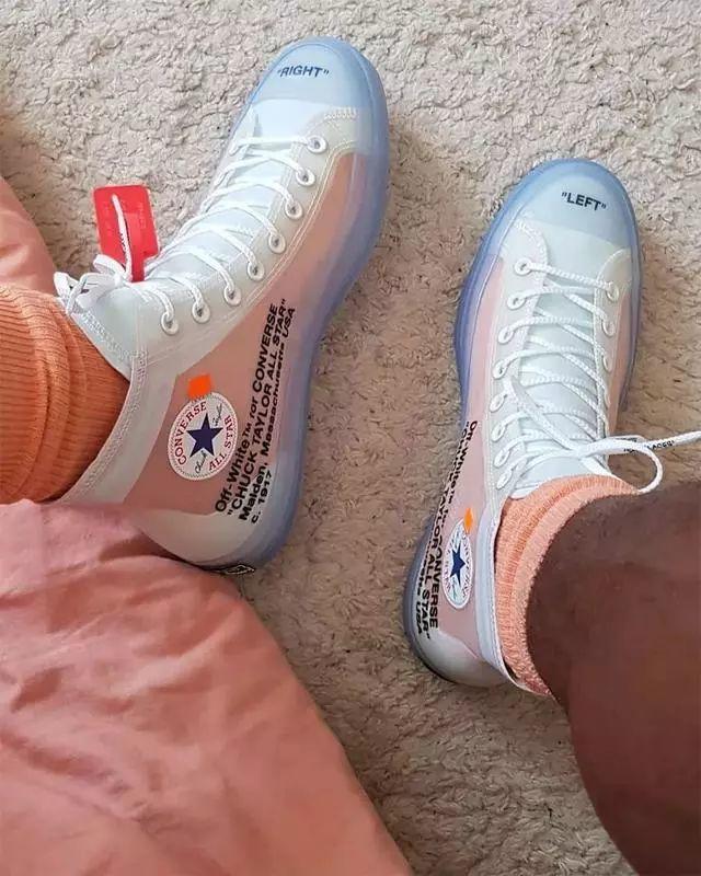 以匡威的经典Chuck Taylor‘70为蓝本,冰蓝色大底,半透明鞋身,内侧的「Off-White for CONVERSE」标签,橙色补丁、红色「Zip-Tie」,侧底沿边的「VULCANIZED」字样,后跟反转的 Chuck 黑章水晶底,潮流之余还带着满满的经典式情怀。