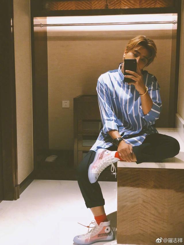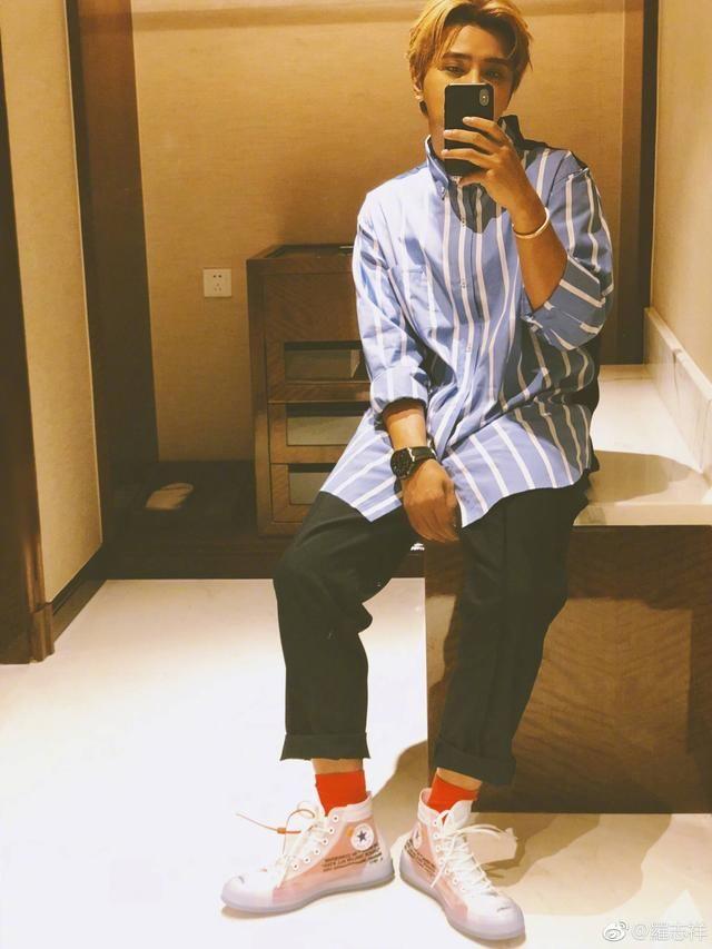 罗志祥这身搭配非常的清新,蓝色条纹衬衫和脚上鞋子的冰蓝底遥相呼应,黑色休闲裤,挽起裤脚,九分长度拉长腿部线条,透明的匡威配上红袜子,骚气满分!