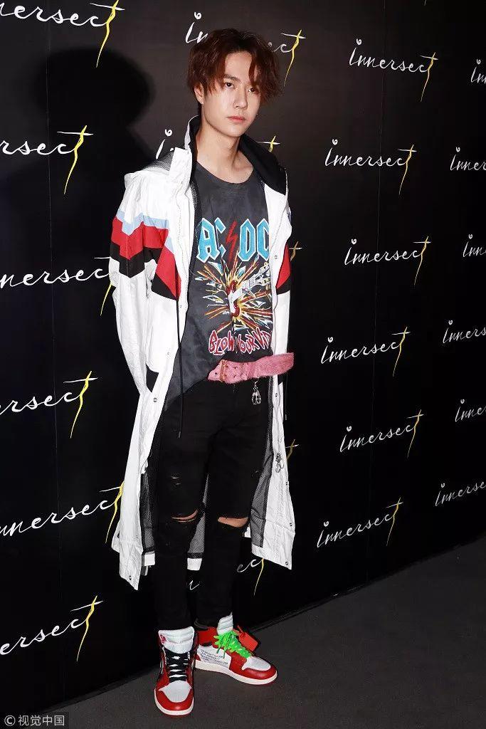 王一博的搭配就更显功底,深灰色印花T恤,搭配一条破洞的裤子,白色长款的风衣,一个标签还满足不了他,换上荧光绿色的鞋带玩撞色,让身上的元素更为丰富,个性十足。