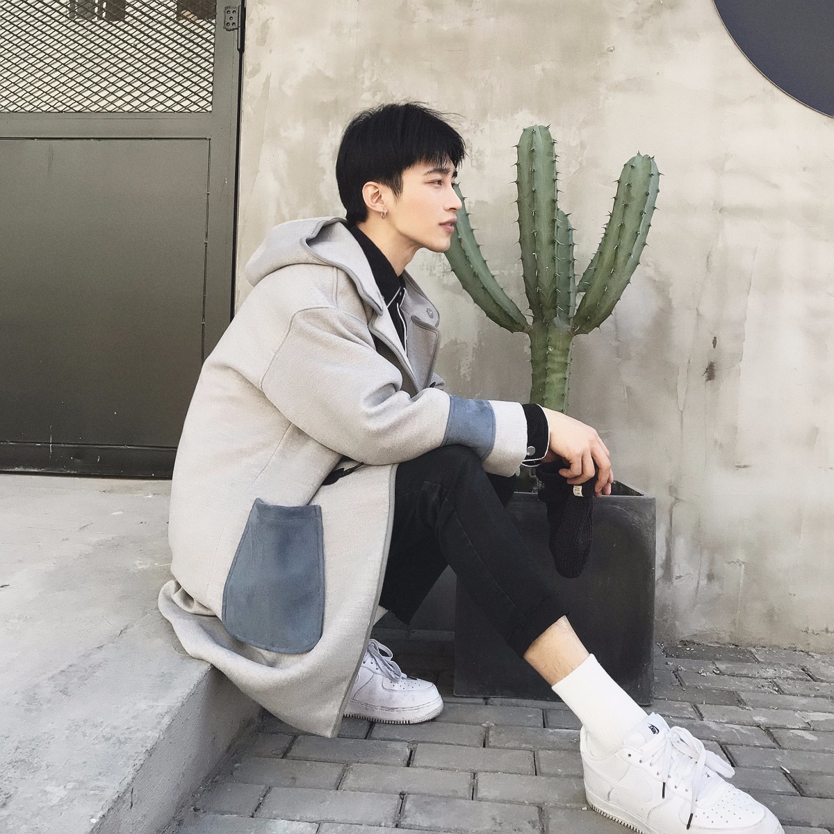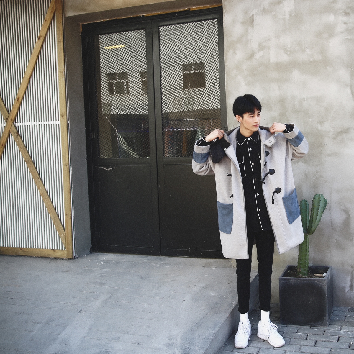 特别定制的毛呢面料,衣服内里绗棉不会过于单薄。以浅灰色为主调,口袋、袖口以深蓝色麂皮绒拼接,色彩对比明显,质感突出。搭配黑色复古牛角扣,整体风格休闲安静。