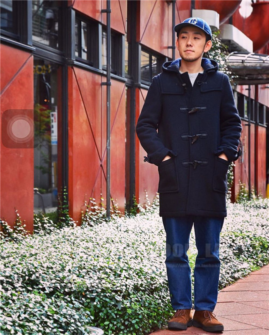 深蓝色与黑色牛角扣组合,配色低调沉稳。翻领搭配连帽,内衬加绒实用而保暖。复合面料用高级的双面做法,版型出众。