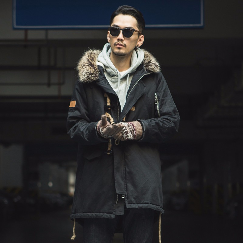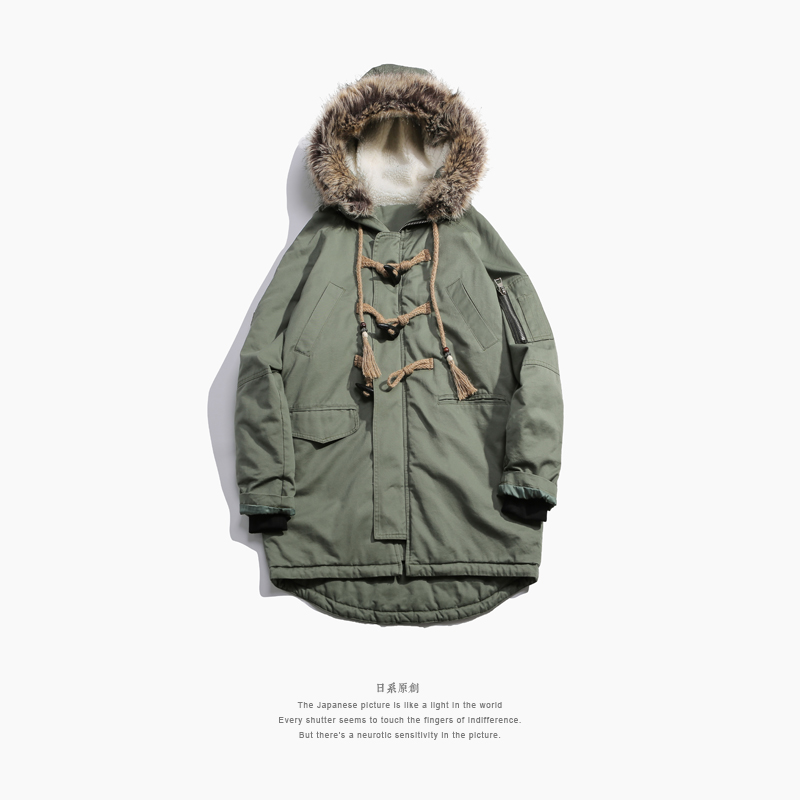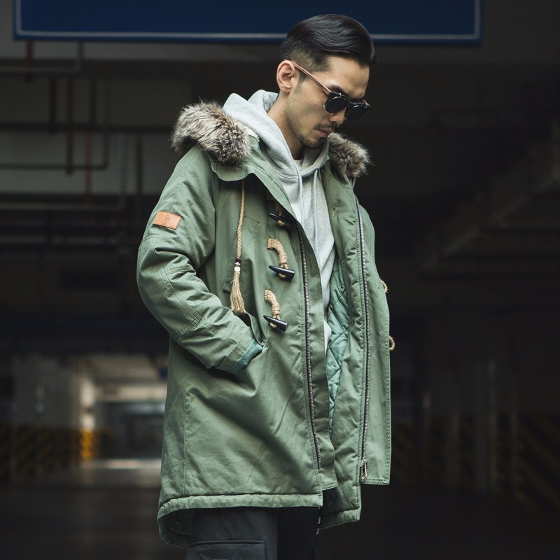 连帽毛领设计提高防风性,并带来温暖视效。内里夹棉以应对寒冷冬日气候。麻绳材质结合牛角扣的设计独具特色。黑色、军绿色都十分易于穿搭。
