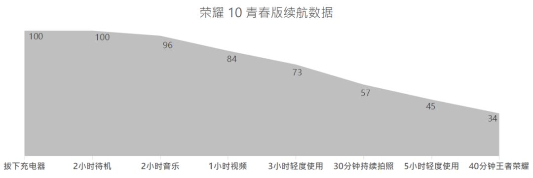 荣耀 10 青春版的电池容量为 3400 mAh,从实际使用来看,荣耀 10 青春版的电池正常使用一天绰绰有余,所以短时间外出的话,充电宝什么的就忘掉吧