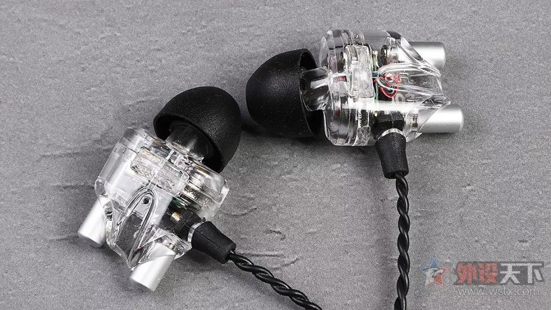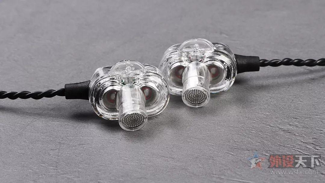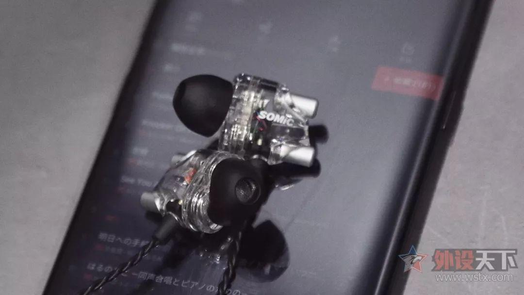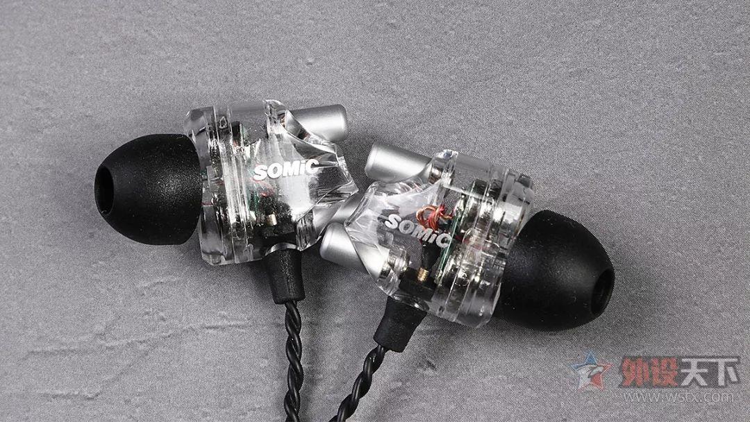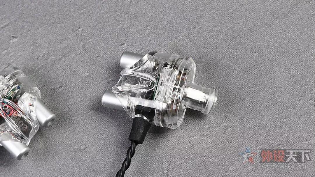 耳机腔体外观并没有使用公模外观,而是采用自行设计的特殊结构外观,外观设计十分新颖。腔体采用了透明材质,用户可以直接看到腔体内的设计,两枚石墨烯动圈单元上下并列,PCB以及内部线材也能看得一清二楚。腔体表面也有“SOMIC”英文的品牌标识。全透明外壳虽然看起来更加通透,直观。但是外壳连接处也能看的一清二楚,让精致感略有下降。