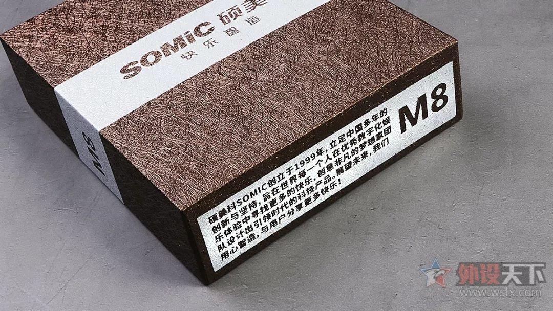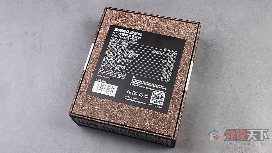 外包装延续了前作的礼盒式包装,特殊的表面纹理让包装质感有很大的提升。包装背面贴纸介绍了耳机的具体硬件参数。侧面则是硕美科的品牌介绍。外包装整体十分简洁。