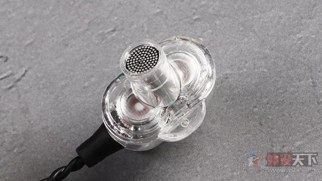 动铁单元被设计师安置在了导管处,摘下硅胶耳套就可以直观的看到,这也是目前业内普遍采用的结构设计。耳机单边采用石墨烯双动圈+动铁单元的配置,动圈单元能够更好的呈现低音,动铁单元弥补动圈在中高频方面的不足,让三频更加均衡。