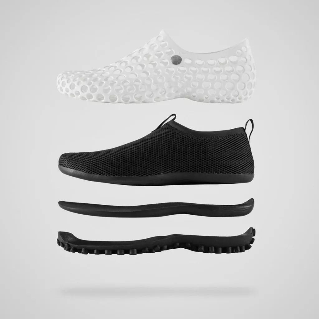 看看这双鞋前卫的造型,你应该就能猜到这不是”一双鞋“那么简单。”太空狗“完全通过计算机设计成形,由可随意组合或拆卸的外壳、组合式外底、内套和内底四部分组成,以适应多种环境用途。