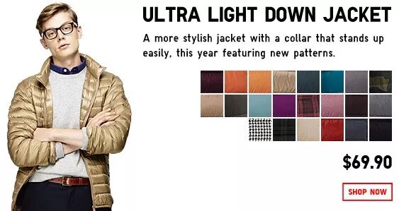 总结:比起同样打“超轻级别的羽绒服”要便宜70%左右,就算拿它与其他品牌的同等价格的羽绒服作比较,提供了更高品质的产品。而且Uniqlo还提供了更多的尺寸颜色和款式,从XS到XXXL,有帽子版或常规版。
