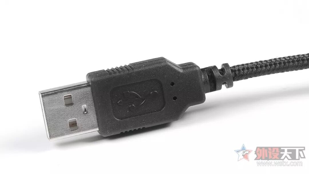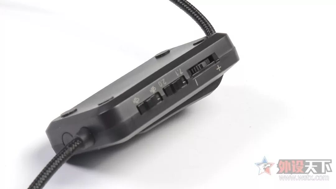 这款耳机的操作面板是外置的,它的顶部设置了LED常亮灯带,而左右两侧则分别布局了音量旋钮、7.1/2.0声道切换按钮、麦克风开关以及EQ切换按键,使用方便,此外,为了保证供电,这款耳机的插头也选择了USB插头,编织线材的加入也让这款耳机的线材耐用度得到保证。