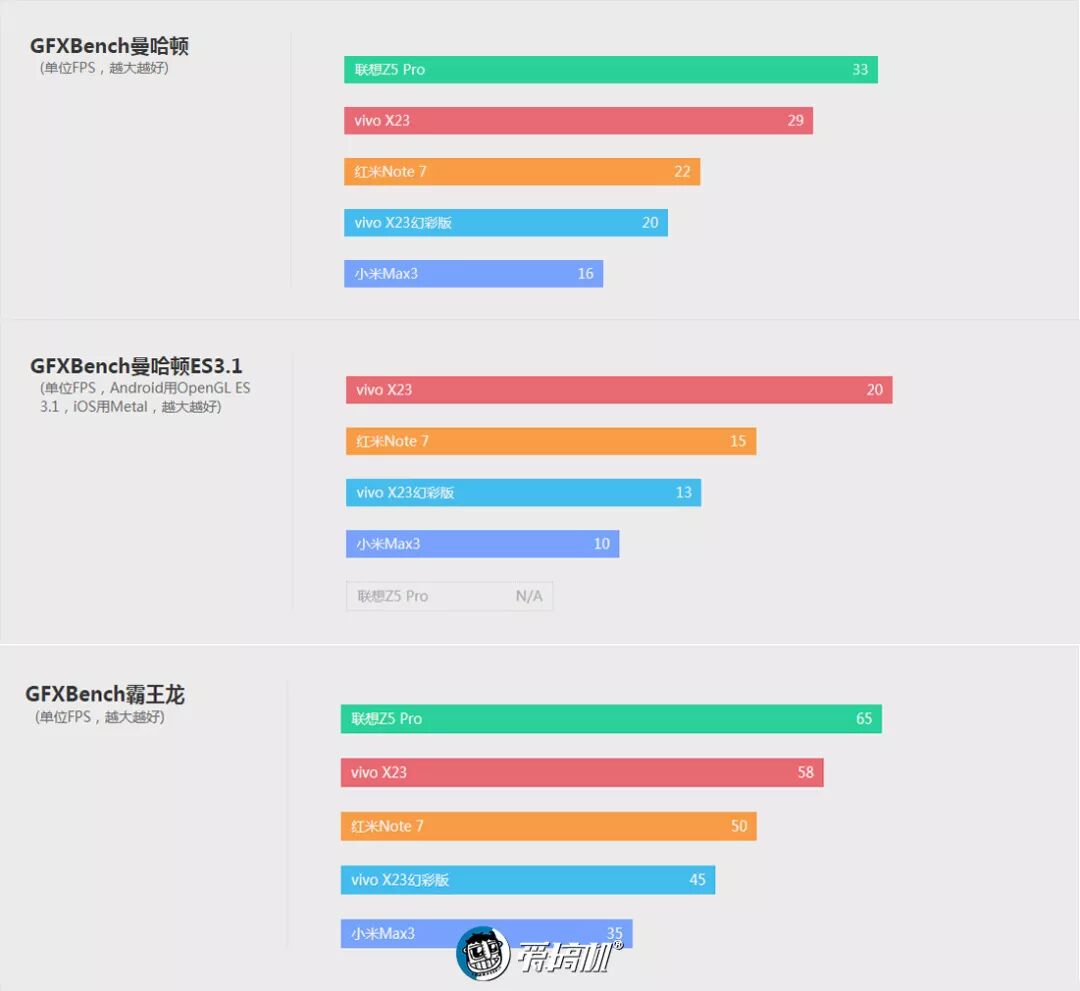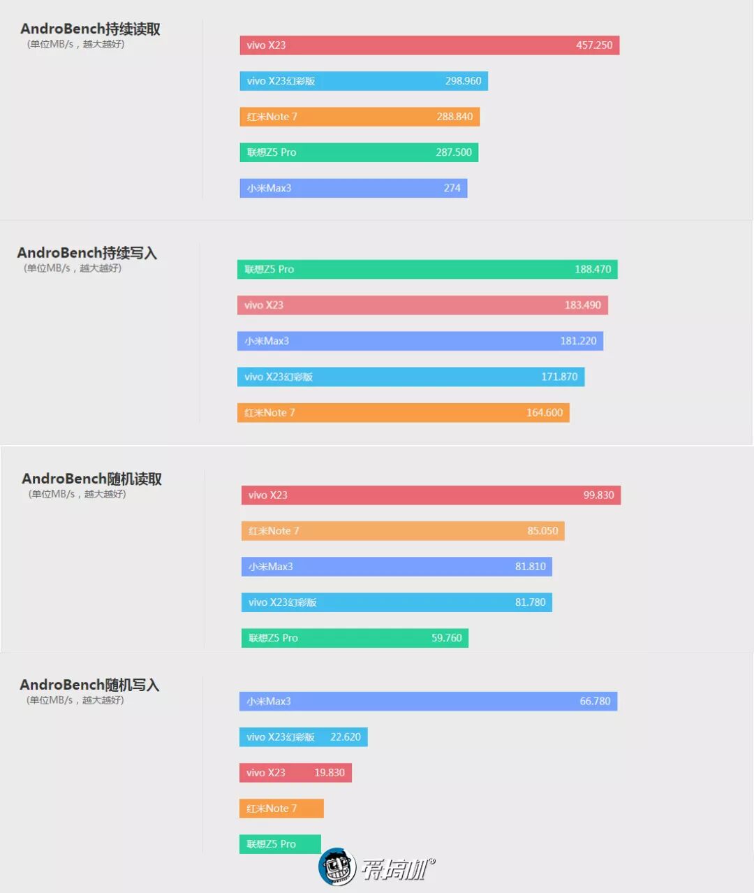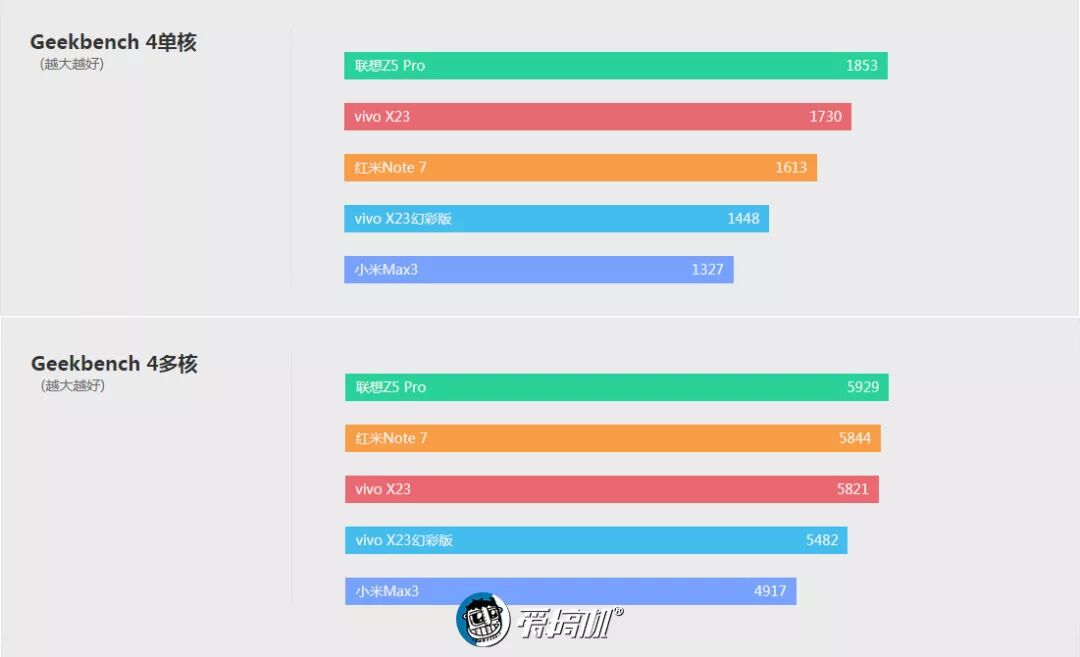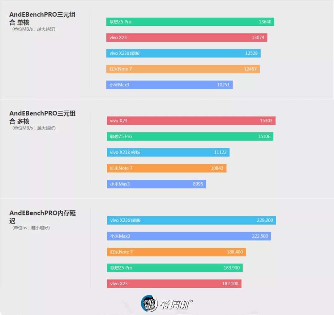 跑分对比联想Z5 Pro(骁龙710)、vivo X23(骁龙670)、vivo X23幻彩版(降频骁龙660)、小米Max 3(骁龙636)