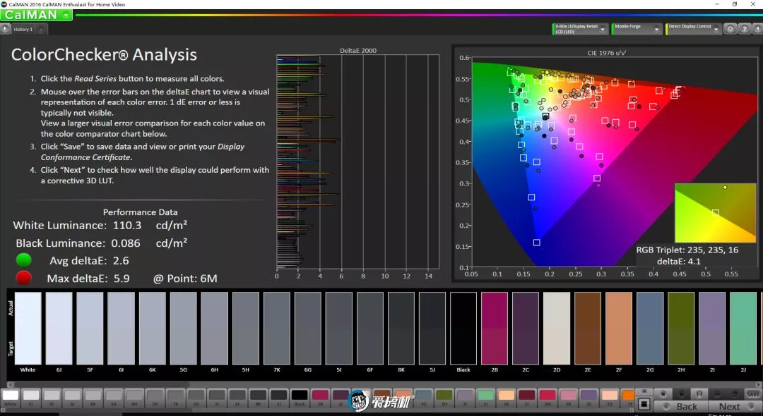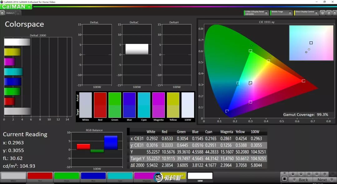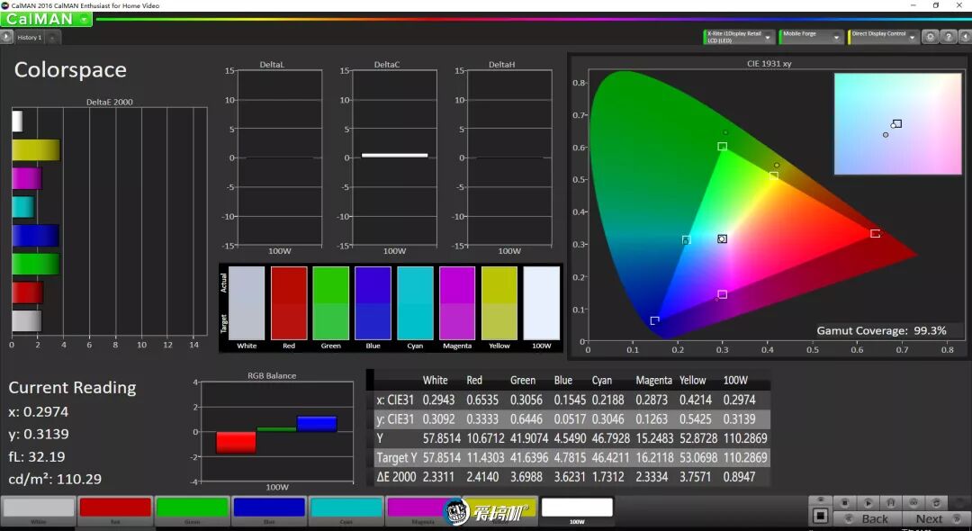 增强模式下,色温7900K,色域覆盖99.3%sRGB,平均色彩偏离2.6,最大色彩偏离5.9。
