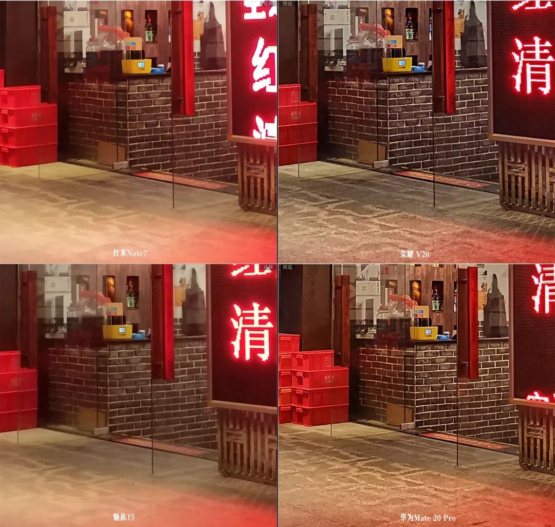 4台机器的观感比较接近,红米Note 7曝光稍低,白平衡偏红。极限解析力接近魅族15,不如荣耀V20。
